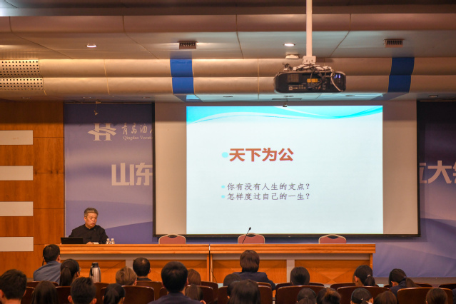 杨朝明以习近平总书记提出的“国无德不兴,人无德不立”为切入点,引出“道”与“德”之间的辩证关系,结合现实,借用典故,对儒家文化进行了深入浅出的解读,阐述了“孝、悌、忠、信、礼、义、廉、耻”八德的道理,介绍了“八德”与中国优秀传统文化的渊源与联系。针对社会现实的焦点和热点问题以及人们的思想困惑,杨朝明运用儒家的价值观念和人文精神,给予理性分析和生动解读,让在场师生产生强烈的心理冲击和思想共鸣,感悟了传统文化所蕴含的价值观念和人文精神。
