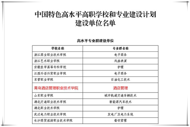 本网讯(党委宣传部)天道酬勤,春华秋实。12月18日,教育部、财政部发布《关于公布中国特色高水平高职学校和专业建设计划建设单位名单的通知》(教职成函〔2019〕14号),学院入选中国特色高水平高职学校和专业建设计划(简称“双高计划”),建设项目为酒店管理专业群,这是“双高计划”唯一立项的酒店管理专业群。