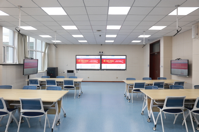 整间教室从智能班牌、电动窗帘、吸音板、LED灯光、环境监测、物联网等全面实现了智能化控制,保障提供最舒适的教学和学习环境;智慧演示系统基于教师端两块86寸显示屏,学生端6块55寸显示屏显示,实现大屏演示和互动,小屏研讨和小组录制。智慧课堂系统集成微信验证、课程班级设计、智慧教学、课堂互动、大数据课堂分析、学生考勤等功能,提供学生学习系统进行实时交流交互,为师生的教学活动提供支撑,增强课堂互动的效果,从而提高教与学的效果。智能录播与导播系统可以实现全方位的智能机位切换与录播,还可以实现远程会议,远程课程直播等功能。