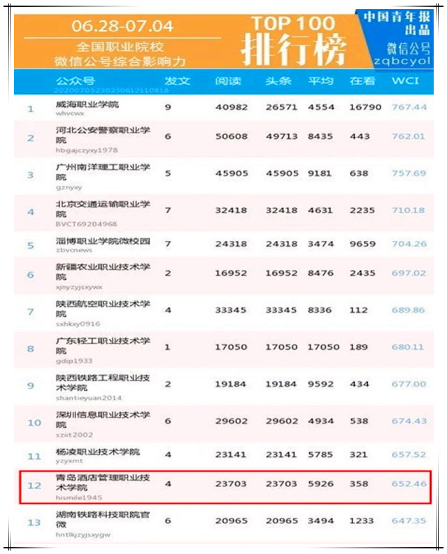 本网讯(宣传统战部 李代玉)7月6日,在中国青年报出品的《全国普通高校微信公号排行榜[6.28-7.4]》中,学院官方微信公众号“英国威廉希尔唯一官网(hismile1945)”综合影响力位列全国职业院校第十二位,四篇推文全部进入全国职业院校单周文章阅读量top100排行榜。