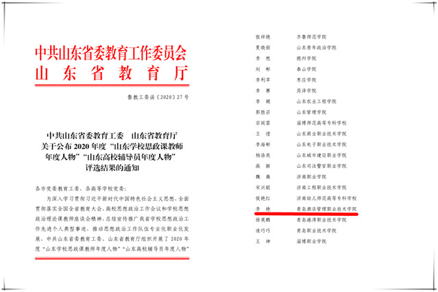 本网讯(学生工作处 朱龙)9月30,中共山东省委教育工委、山东省教育厅下发《关于公布2020年度“山东学校思政课教师年度人物”“山东高校辅导员年度人物”评选结果的通知》(鲁教工委函〔2020〕27 号),酒店管理学院辅导员李艳老师获评“山东高校优秀辅导员”。