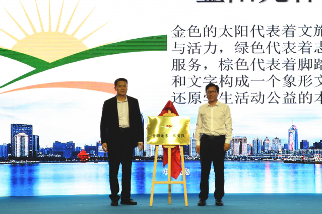 表彰大会上,姜玉鹏、张宗国共同为金阳光志愿服务队揭牌并为志愿者代表颁奖。