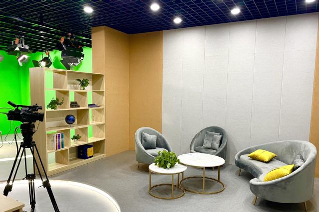 融媒体录制中心和智慧教室位于图书馆五楼。融媒体录制中心分为虚拟抠像区域、实景拍摄区域。其中,实景区域具有演讲比赛、汇报、节目录制等功能;虚拟抠像区域具有自由更换场地背景、自由组合录制画面等功能。录制系统均以广播级摄像机录制技术为基础,结合虚拟技术的辅助,可通过全景照片、PPT简报、网络资源、摄像机或者真实取景,使教师置身充满未来感的场景中,并可以进行网络同步直播,真正打通授课零距离。
