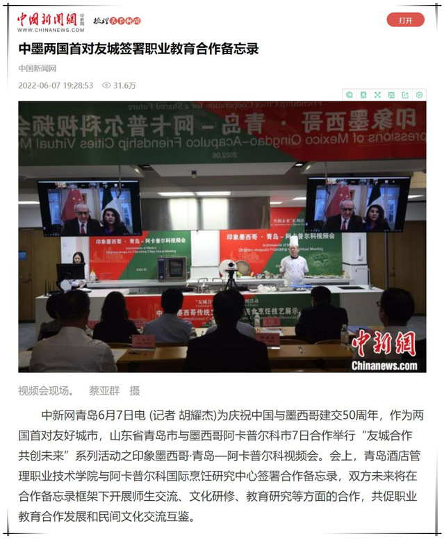 本网讯(国际交流与合作处 张晴)近日来,《中国日报》、中国新闻网、中央广电总台国际在线、凤凰网、《香港商报》、青岛广播电视台、青岛之窗、《青岛晚报》、青岛财经网、蓝睛等多家媒体持续报道学校签约墨西哥阿卡普尔科国际烹饪研究中心,引起了良好反响,提升了学校的社会影响力和美誉度。