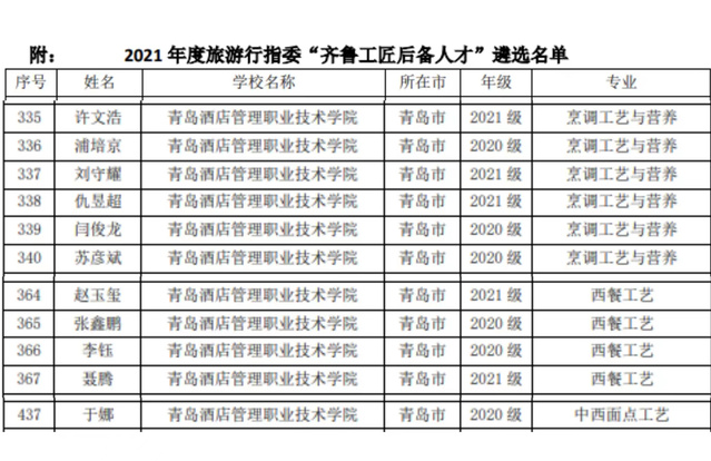 本网讯(烹饪学院 赵捷)近日,山东省旅游职业教育行业教学指导委员会公示了2021年度旅游大类“齐鲁工匠后备人才”培育对象遴选名单,全省共有440名学生被列为培育对象,威廉希尔官网烹饪学院11名学生入选。