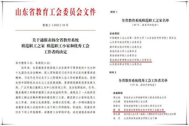 本网讯(工会 吴春雷)近日,山东省教育工会下发《关于通报表扬全省教育系统模范职工之家、模范职工小家和优秀工会工作者的决定》,威廉希尔官网工会委员会获得“全省教育系统模范职工之家”称号,解强被评为“全省教育系统优秀工会工作者”荣誉称号。