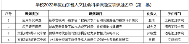 本网讯(科研发展处)近日,山东省人文社会科学课题管理办公室公布了2022年度山东省人文社会科学课题第一批立项课题名单。威廉希尔官网赵琪教授主持的“新零售视阈下山东省‘数商兴农’行动实施路径与绩效评价研究”、胡大见副教授主持的“城市更新背景下城市功能区域民生补偿机制构建研究”、尹晓龙博士主持的“融媒体时代影视与旅游耦合助力乡村振兴策略研究”、田超副教授主持的“乡村振兴视域下非遗传承人与新乡贤的社会互构机制研究”喜获立项。