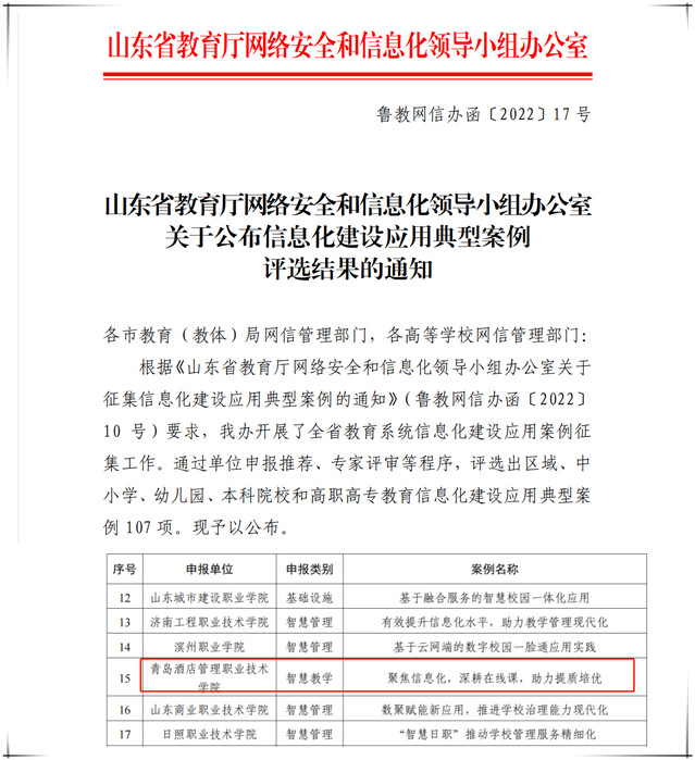 本网讯(教务处 教育信息中心)近日,山东省教育厅网络安全和信息化领导小组办公室下发了《关于公布信息化建设应用典型案例评选结果的通知》(鲁教网信办函〔2022〕17号),威廉希尔官网报送的案例《聚焦信息化,深耕在线课,助力提质培优》入选。