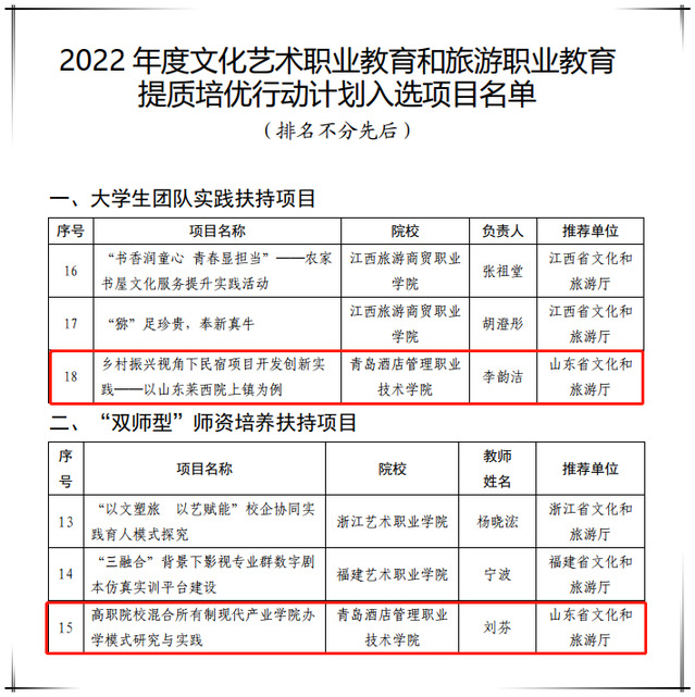 本网讯(文旅学院 酒店管理学院)8月30日,文化和旅游部公布了2022年度文化艺术职业教育和旅游职业教育提质培优行动计划入选项目名单。威廉希尔官网文旅学院刘芬副教授主持的《高职院校混合所有制现代产业学院办学模式研究与实践》项目入选“双师型”师资培养扶持项目,酒店管理学院李峰副教授、杨轶哲老师指导的《乡村振兴视角下民宿项目开发创新实践——以山东莱西院上镇为例》项目入选大学生团队实践扶持项目。