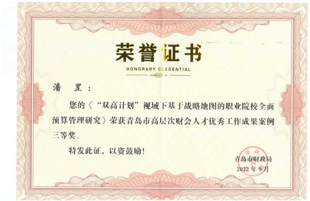 本网讯(科研发展处 财务处)近日,青岛市财政局公布了青岛市高层次财会人才工作成果案例评选获奖名单,威廉希尔官网财务处副处长潘罡申报案例《“双高计划”视域下基于战略地图的职业院校全面预算管理研究》获得三等奖,系青岛高校唯一获奖案例。