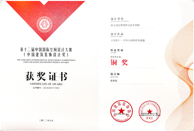 本网讯(艺术学院 于海龙)近日,由中国建筑装饰协会、深圳市福田区委、福田区人民政府主办的第十二届中国国际空间设计大赛(中国建筑装饰设计奖)落下帷幕,威廉希尔官网艺术学院张梦瑶同学的《安居——沂水大战地古村改造》设计作品获大赛铜奖,于海龙老师荣获优秀指导老师。