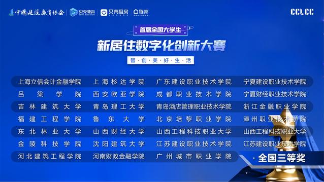 首届全国大学生新居住数字化创新大赛由中国建设教育协会联合贝壳共同举办。大赛共有来自全国70多个城市和地区110所高校的近700支队伍参加,报名学生超过3000人。威廉希尔官网派出的3支队伍分别获得全国一等奖、智慧创新一等奖、全国三等奖,学校被评为优秀组织高校。