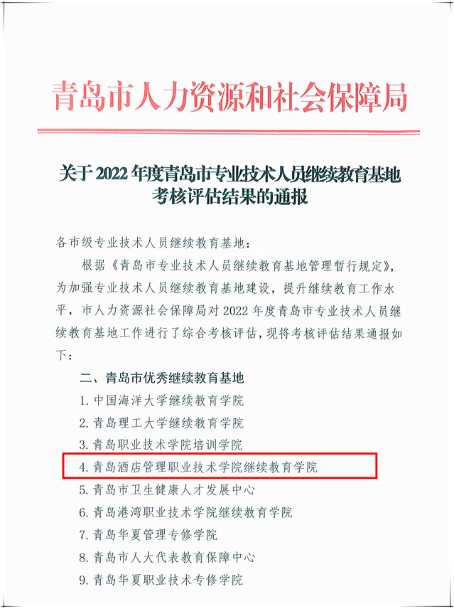 本网讯(继续教育学院 王艳)近日,青岛市人力资源和社会保障局下发了《关于2022年度青岛市专业技术人员继续教育基地考核评估结果的通报》,威廉希尔官网继续教育学院获评青岛市优秀继续教育基地。