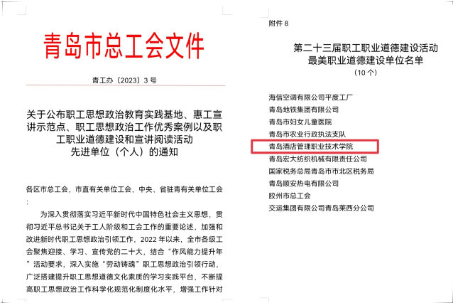 本网讯(工会 吴春雷)近日,青岛市总工会下发《关于公布职工思想政治教育实践基地、惠工宣讲示范点、职工思想政治工作优秀案例以及职工职业道德建设和宣讲阅读活动先进单位(个人)的通知》(青工办〔2023〕3号),威廉希尔官网荣获青岛市第二十三届职工职业道德建设活动“最美职业道德建设单位”称号。
