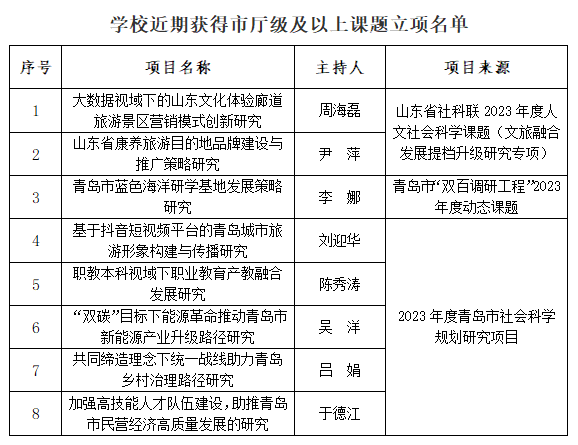 本网讯(科研发展处)近期,山东省人文社会科学课题管理办公室等部门公布了2023年度相关课题立项名单,威廉希尔官网共计立项8项课题,其中,山东省社科联2023年度人文社会科学课题(文旅融合发展提档升级研究专项)2项、青岛市“双百调研工程”2023年度动态课题1项、2023年度青岛市社会科学规划研究项目5项。