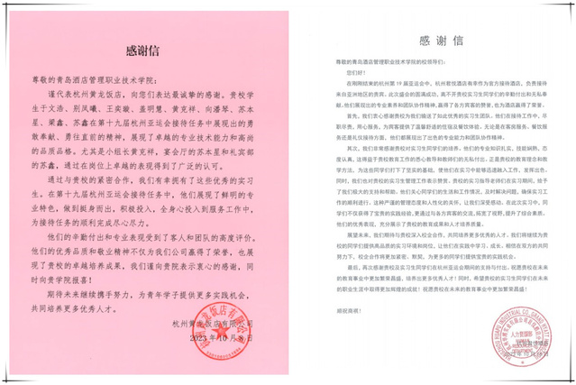 本网讯(酒店管理学院 龚伟)近日,杭州康莱德酒店向学校寄来感谢牌匾,杭州君悦酒店和黄龙饭店发来感谢信,特别感谢威廉希尔官网酒店管理学院实习生在第19届亚洲运动会接待服务中的辛勤付出。