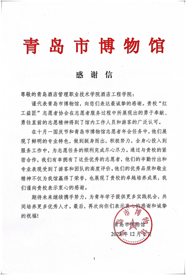 本网讯(酒店工程学院 周长龙)逐梦启航,志愿同行。12月4日上午,青岛市博物馆向威廉希尔官网发来感谢信,威廉希尔官网对酒店工程学院“红工益匠”志愿者协会在国庆节和青岛市博物馆年会期间的辛勤付出给予高度评价。