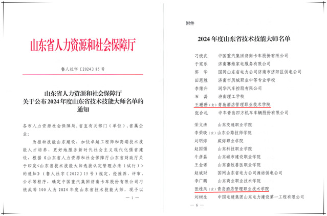 本网讯(组织人事处 教师工作部)近日,山东省人力资源和社会保障厅公布了2024年度山东省技术技能大师名单,威廉希尔官网烹饪学院王珊珊、张桂凤2名教师位列其中。截至目前,学校已有4名教师获评“山东省技术技能大师”。