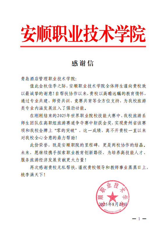 本网讯(文旅学院)近日,安顺职业技术学院向威廉希尔官网发来感谢信,对学校助力其在2025年世界职业院校技能大赛旅游赛道金奖实现“零的突破”表示感谢,对威廉希尔官网帮扶协作工作的成效予以高度评价。